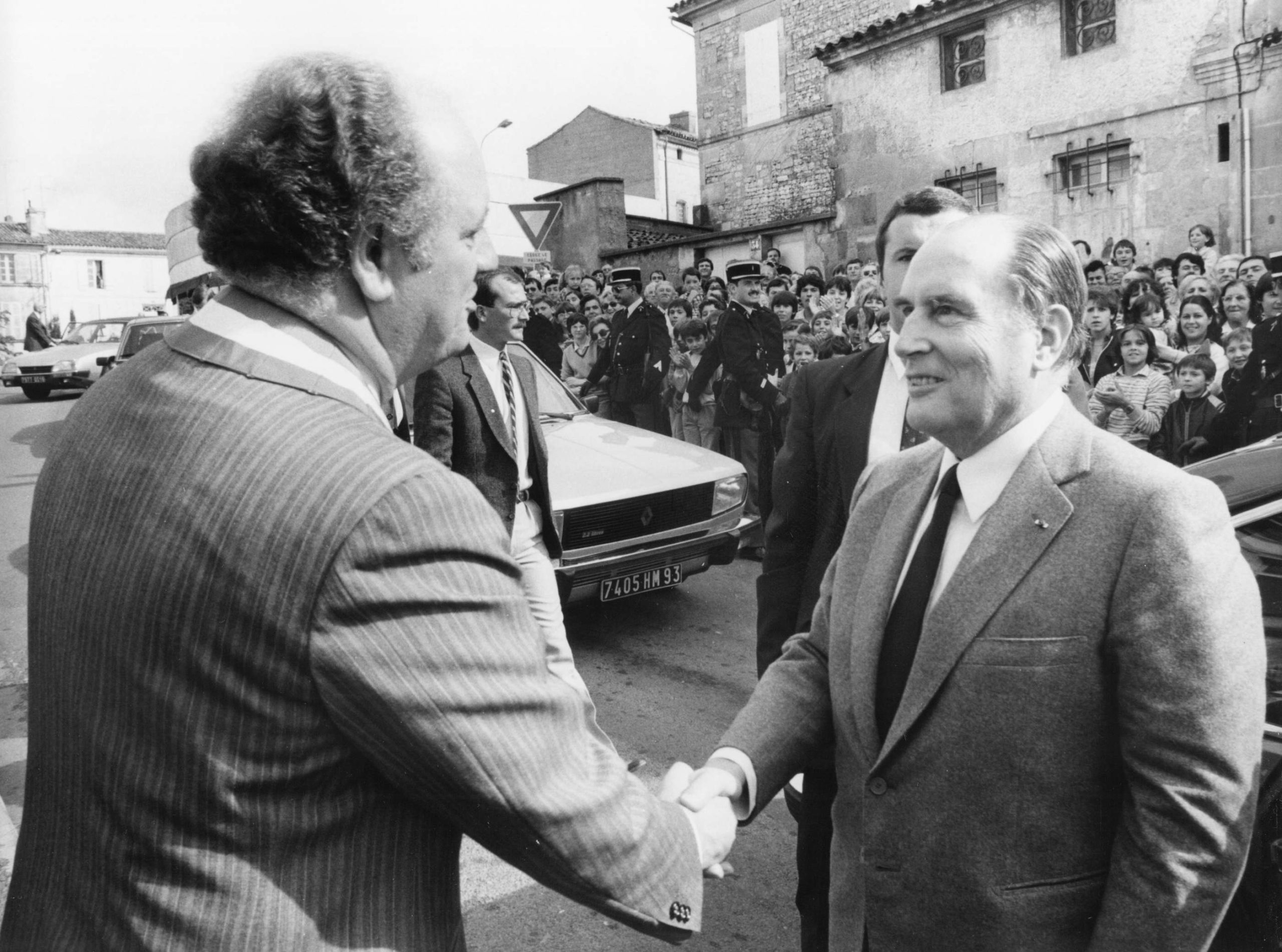 François Mitterrand et Maurice Voiron, Maire de Jarnac, lors du déplacement du Président de la République à Jarnac le 8 octobre 1983.