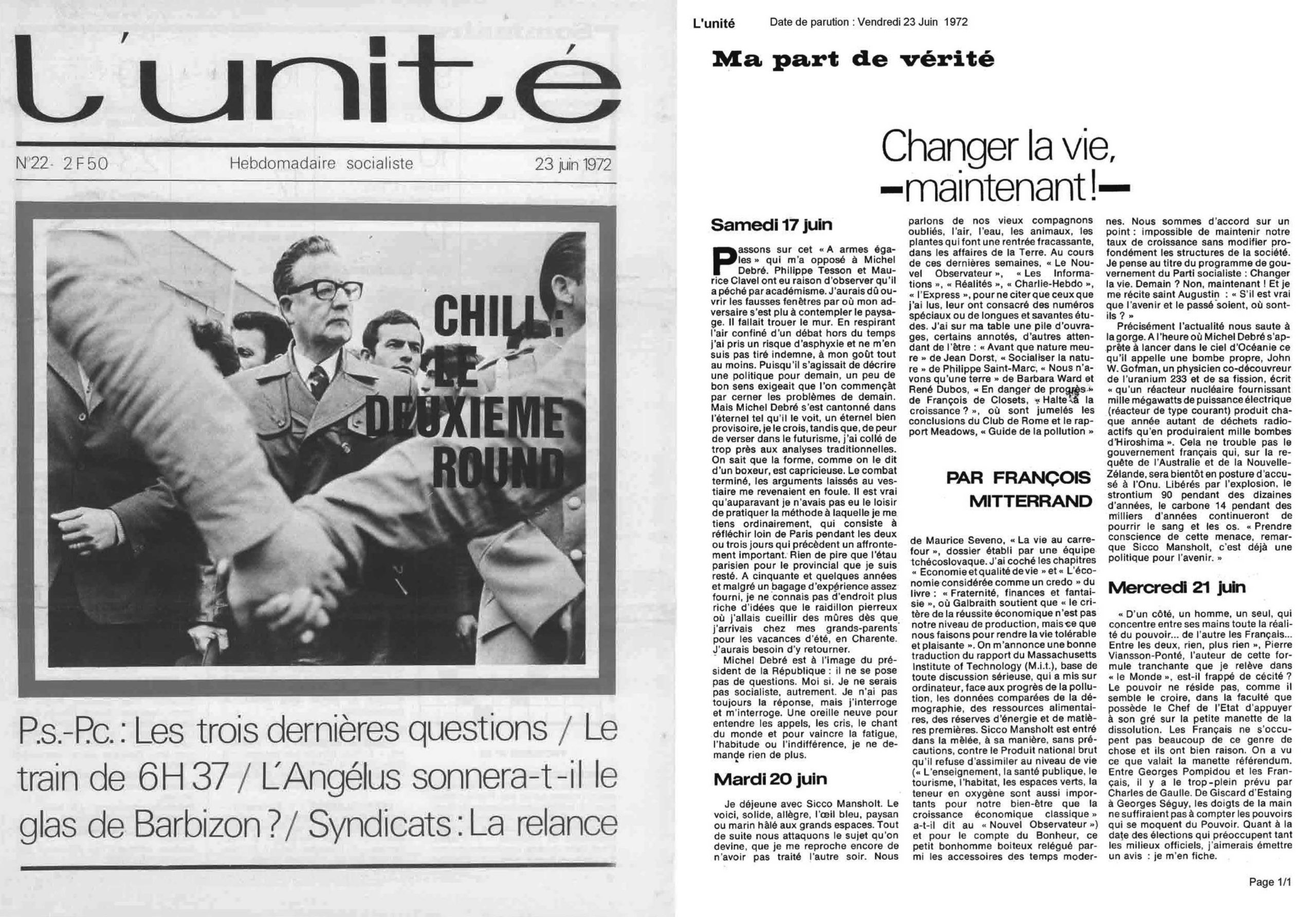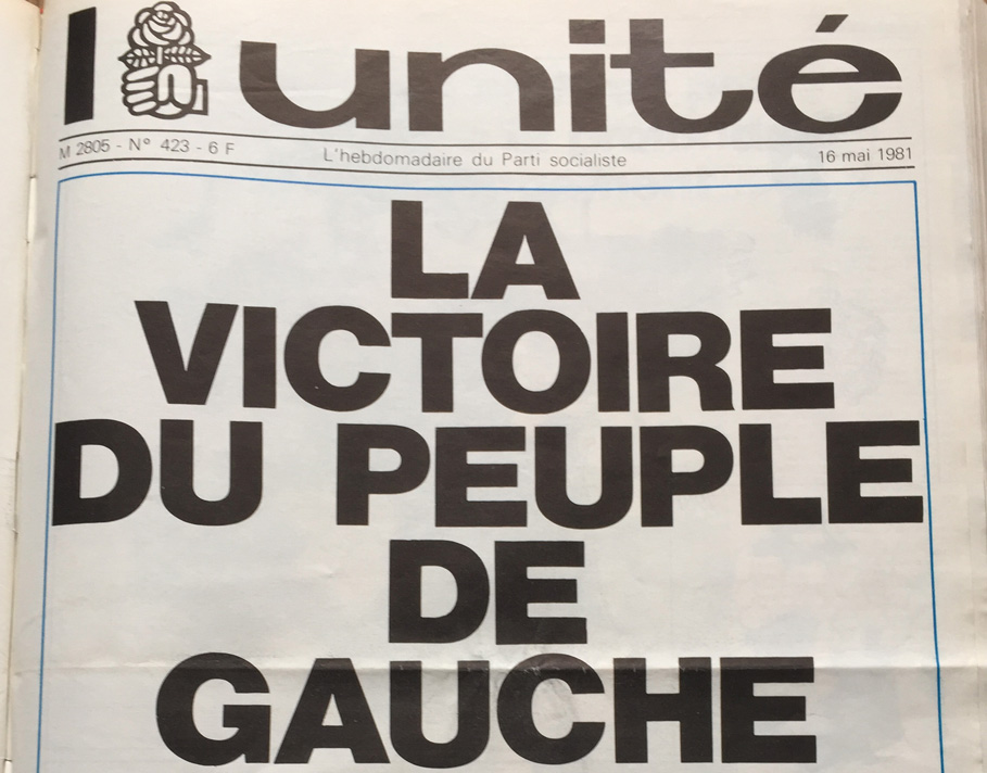 Le 16 mai 1981 paraissait le premier numéro de l'Unité de l'après 10 mai. Sur la couverture, aucune photo, le titre de l'Editorial de Claude Estier s'impose sur la moitié de la page : "LA VICTOIRE DU PEUPLE DE GAUCHE".